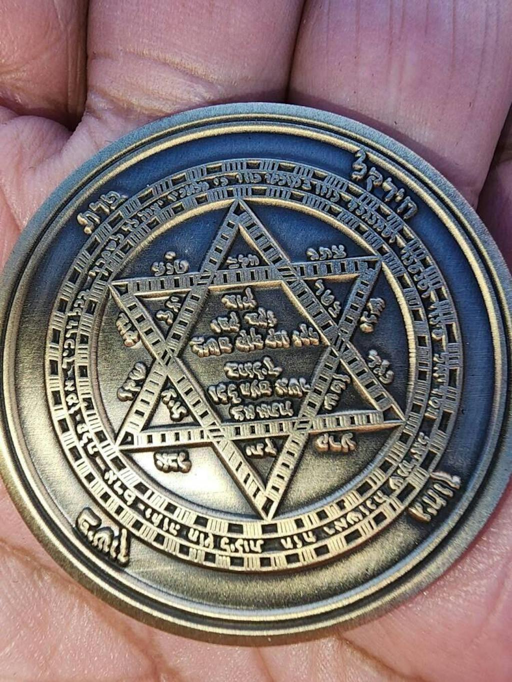 Double sided brass coin with Kabbalistic symbolism