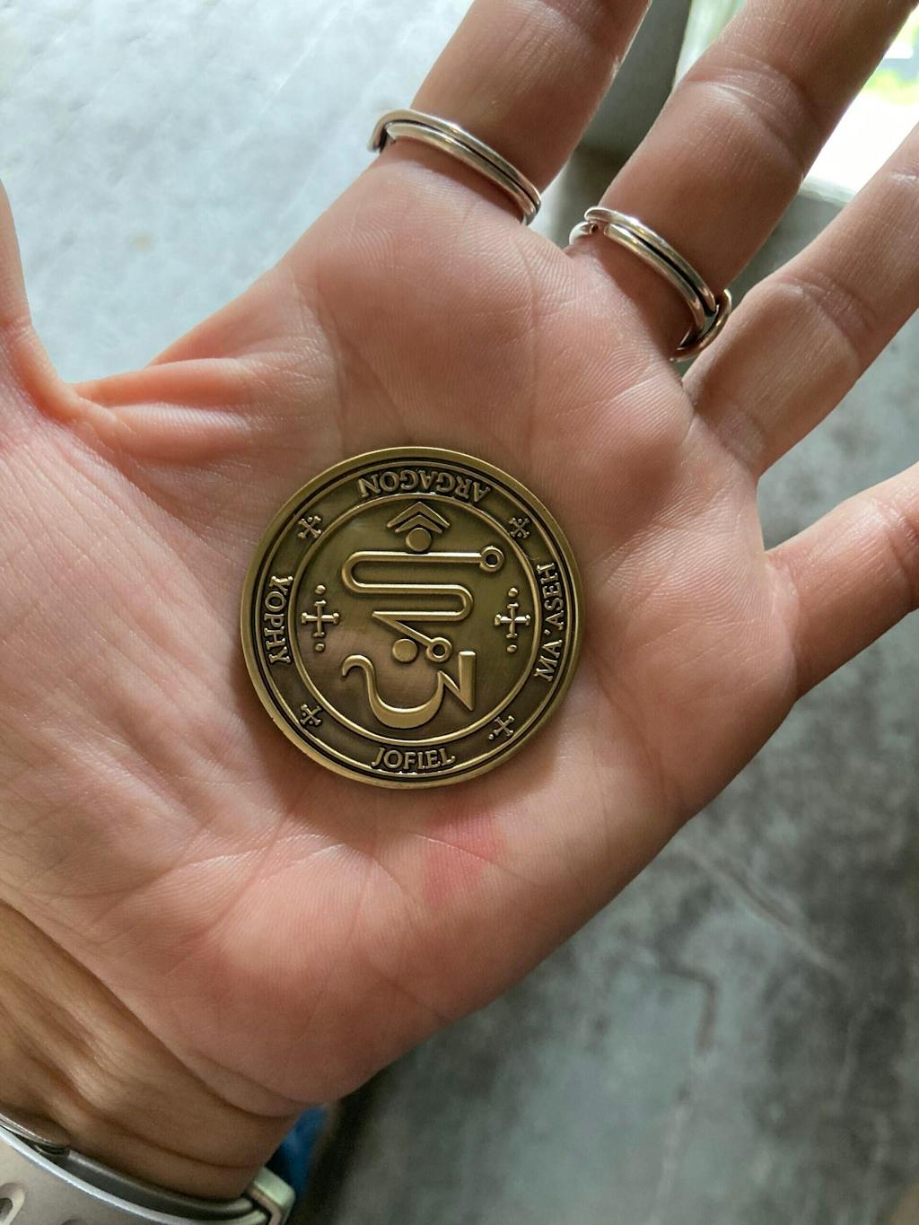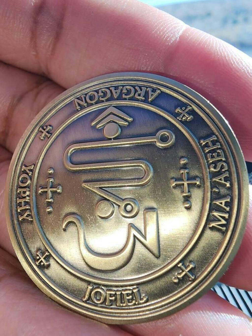 Double sided brass coin inspired by traditional angelic and Solomonic symbolism